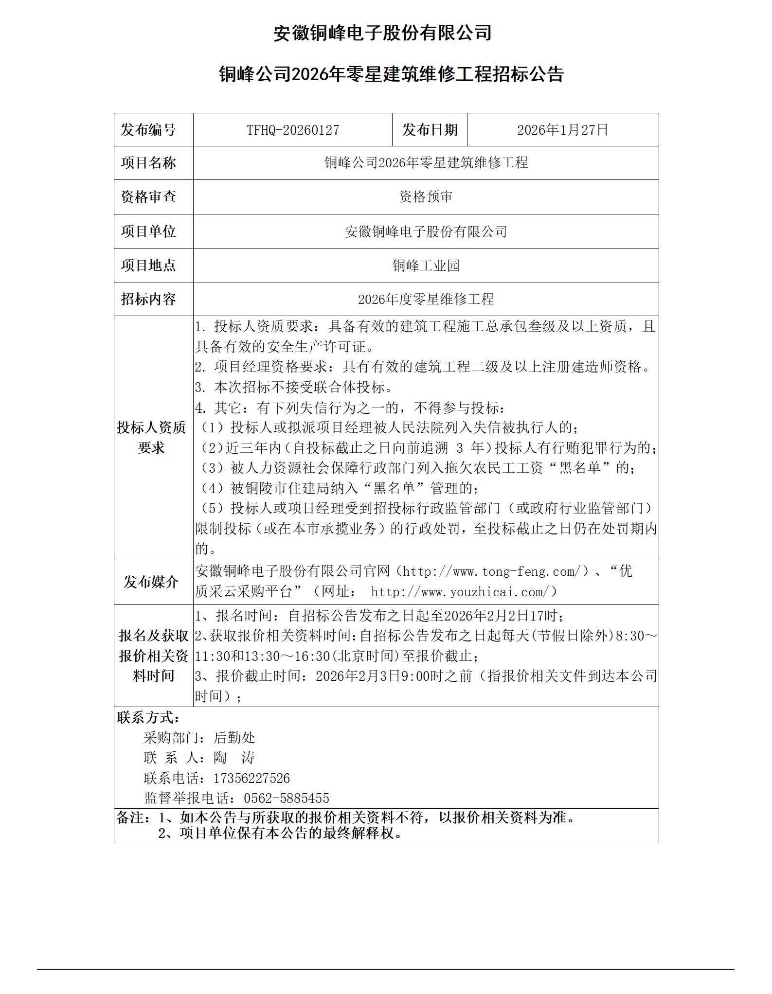 安徽銅峰電子股份有限公司 (銅峰公司2026年零星建筑維修工程 招標(biāo)公告)_01